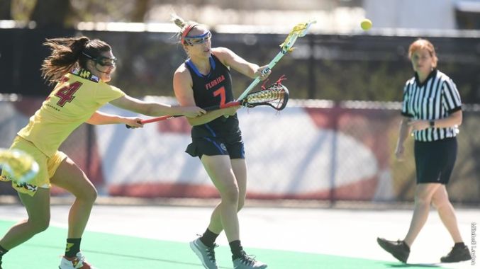 via press release – photo via UF web site Box Score COLLEGE PARK, Md. – The University of Florida women’s lacrosse team (8-2) dropped an 18-8 decision on the road at No. 1 Maryland (10-0) on Wednesday.No. 3 Florida kept the game close in the first half, and only trailed the Terrapins 4-3 with 5:10 left before halftime after a Lindsey Ronbeck goal.The Gators outshot Maryland 24-17 in the first half, but Maryland’s goalkeeper Megan Taylor saved 15 of those shot attempts on her way to a 20-save performance.Sophomore attacker Lindsey Ronbeck led the way for the Gators with four goals, three ground balls, and two draw controls. Junior attacker Shayna Pirreca added two goals for Florida.Defenders Aniya Flanagan and Cara Trombetta each caused two turnovers, with Trombetta adding a team-high four ground balls.Sophomore goalkeeper Haley Hicklen registered seven saves and one ground ball while facing 36 shots.Records: