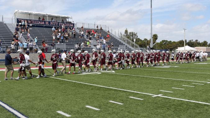 Thanks to Jeff Horwitz for the Stoneman-Oxbridge pictures! If I get any submitted for St. Ed’s-Lake Mary I’ll add those too! EDIT: I received three pictures from St. Ed’s-Lake Mary from Angie Herman and added them to this article; Thank you Angie!Okay, it’s finally over . . . 6 games attended in a 22-hour period. Ended with the Florida Tech one-goal win over Lynn on a pretty crazy goal. The FIT long pole, in a 10-10 game, goes on the fast break and ends up getting trapped by multiple defenders about 5 yards right in front of the cage with his back to the goal and decides to shoot the shot over his back, and it happens to hit the net for the game winner! I wanted to make sure I got to that game for a couple of reasons. First, I enjoy the game experience at the Lynn field. An all-seater set of stands set right on the field and easy parking. A great SSC matchup of two teams that embody what the conference is about. But most importantly, it was the last chance to see the Zugelter family, who have been fans of the site since the start. Austin was playing his likely last game in Boca (maybe a late draft pick for the Launch?) and knowing Tom and Joyce for so long I knew they would be at the game even if I hadn’t heard from them beforehand. Austin played a major role in one of my favorite games in the 5 years I’ve written here and it just felt like I wanted to get to Lynn in time. Of course I found them in the midst of the rowdy FIT section of the stands . . . a good rowdy group of cheering parents as the game came down to the wire. We got caught up and just had a nice time talking. Austin is an excellent example of a kid who understood the recruiting process well. All of us who watched him in high school understood what a matchup nightmare he was and that he was easily a D1 talent. But he knew what he wanted to focus on academically and since FIT had the program he was mostly interested in he went the D2 route instead. BTW, he still is a matchup nightmare, and he will graduate this year with the career path right in front of him. Congrats to Austin and hopefully Tom will fill the extra time on his hands next season with some sort of role that keeps him in front of a sport he has come to love. And Joyce has promised me a recipe that I will like . . . The first two games I covered in the article A Glorious Day in Florida Lacrosse! and yesterday morning the matchups got switched as Stoneman faced Oxbridge and Lake Mary faced St. Edwards in the second one. Stoneman and St. Edwards played in the first game on Friday and it frankly was no surprise to see that the teams that played early had an advantage over the teams that played the second game. You would not think that a two hour difference would be that impactful for the early game but both Oxbridge and Lake Mary certainly showed less energy in their play on Day Two. Throw in that in the scheme of things that the games probably meant more to Stoneman and St. Edwards given the time of the season and their previous games and the extra effort was there for them. The weather was absolutely gorgeous . . . can’t use glorious TOO often . . . mid 60’s to start, blue skies with a little cloud cover and the perfectly defined south Florida version of breezy. Got warmer during the games but never to the point of where it was draining to the players or the fans. The only complaint was a lack of coffee given I didn’t get home the previous night until about 10:00pm. On Friday Coach Ross was worried about how much his team had left in the tank and his fears were realized as Stoneman, after an early two goal outburst by Oxbridge, slowly took over control of the game with a collection of long possessions and with less than a minute left in the first half took the lead for good at 4-3 as Daniel Sgammato continued his second half impact on Stoneman’s offense, giving them that extra option that was missing early in the season. This was how the first half ended . . . kind of fun . . . From that point forward, from the first minute of the second half, it was all Stoneman. They went over 7 minutes of possession to start the half before Oxbridge even had an offensive possession. By then it was 7-3 as Sam Bailin started to heat up. FOGO Kevin Horwitz was on his way to a domination of the faceoff circle. Oxbridge then switched up strategy at the dot and Terrell Seabrooks started to come through, with OA then scoring twice in a little over a minute on Jack Kilian’s two goals but that was pretty much it. Horwitz made the adjustments and Bailin came through twice to make it 9-5 and then pulled away in the fourth as 5 different Eagles scored. A last second score by Oxbridge made it a 12-7 final. Coach Burton kidded with me after the game about whether this was the signature win I was looking for, and it certainly looked like it. A proud father of Ryan, having made the trip down from upstate NY, confirmed the opinion. Nice to meet you Sir! The second game was Lake Mary facing off with St. Edwards. Each team were the victims of one goal losses the previous day and both certainly were looking to avoid a 2-loss weekend. Wish I had some more time with St. Ed’s head coach Doug Bailey before the game since I’d like to understand more about the situation with the Vero kids’ transfers and how he’s integrated so many into the team offense and defense so quickly. Also felt bad for Danny Walsh on the sidelines since he had impressed me so much last year in the game I saw at West Boca. St. Ed’s has take a major leap this season and in my pre-season podcast with Mike Loveday I noted that they needed to be considered but that I needed to see early results first. Last year’s schedule was substantially beefed up this year and it was the right choice. Lake Mary has been hot and cold all year and a lot of it is based on shooting and playing 48 minutes. They started the game yesterday as if on a mission as they ran out to a 3-0 lead early in the 2nd quarter as the