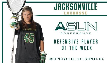 LAKEPOINT, Ga. – After a stellar outing in goal for Jacksonville University women’s lacrosse, graduate student Emily Poelma was named ASUN Conference Defensive P…