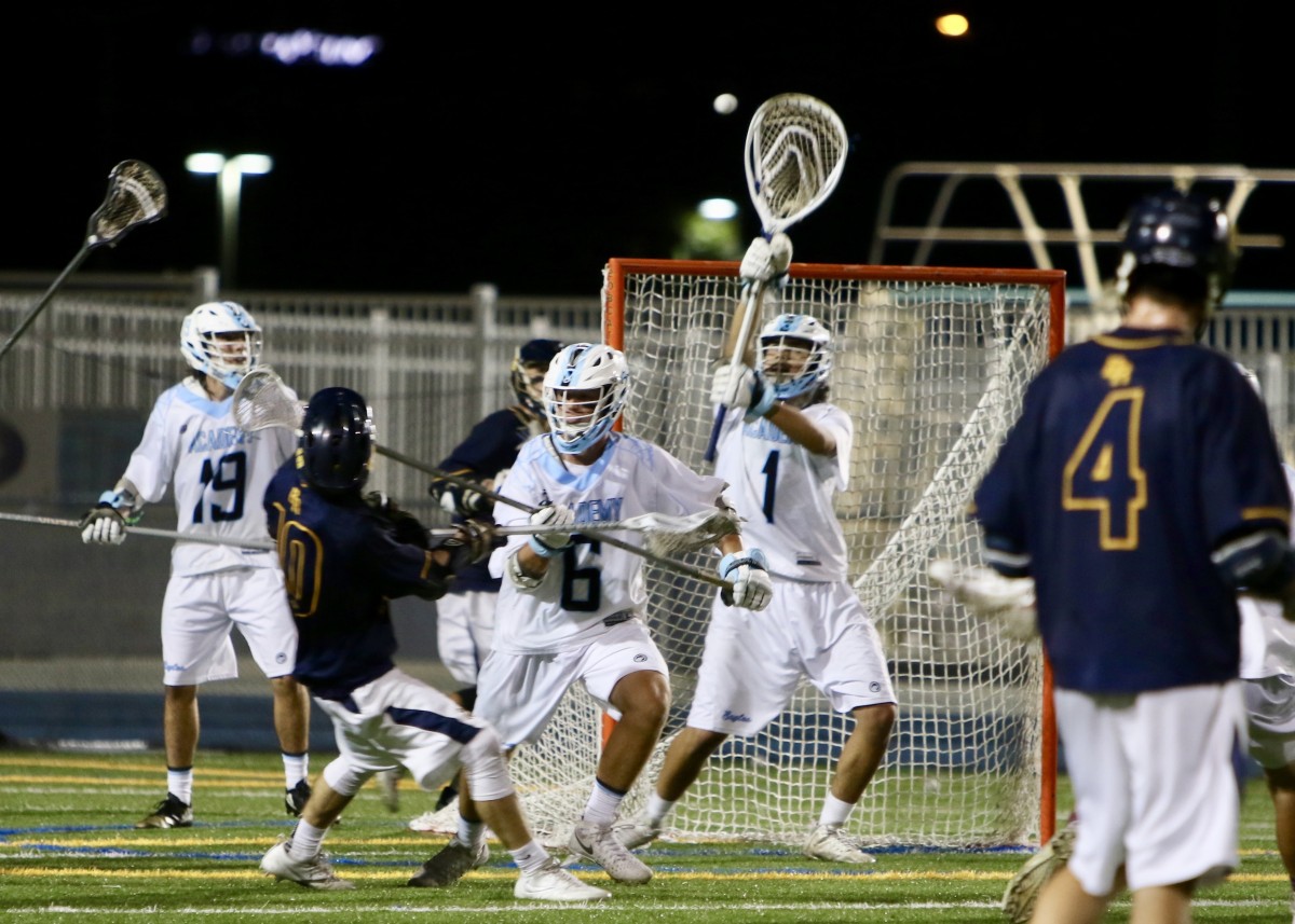 Meanwhile, the older brother decided to teach the little one a lesson. And it was a pretty good one. A 6-0 run in the quarter to turn the game around fully in their favor. The ball swung around quickly, the simple mistakes stopped for the most part, and the final 3 seconds looked like the slam dunk on the breakaway to tell the younger one ‘you’re not there yet’.But then they did it again and went back to sleep.It didn’t hurt them at first as AH/B struggled to get good looks but then the penalties started to pile up as the defense reached instead of moving their feet and AH/B took advantage to score twice midway through the period and it was now 13-10 with 7 minutes left.And all of a sudden the sloppiness started up again and AH/B was getting some looks and it took some late heroics by SA’s goalie Nick Ferraro on two clean breakaways that would have made it a 2-goal game with 3 minutes to go and that was pretty much it. A last second goal by SA was almost an act of defiance, but it didn’t mean anything in the scheme of things.The easiest way to tell about this game? The winning coach wasn’t terribly happy but the losing one was full of smiles afterwards.And neither legend was wrong.The second game actually started with as minimum a period of time between the games as I can remember. Or maybe I lost track of time a little bit?The teams know each other so well. They pretty much play twice every year since they finish 2 and 3 pretty much all the time. Not a lot of newness to the feel.But an intensity level that tends to peak early until the teams settle into the game.Both on the field and off.The sitting arrangement for the second game was, shall we say, spaced? The SA and AH/B rooting sections were pretty much sitting together. The Boca and SJP sections were not. And the Boca section was also broken up into students and others. I think it is kind of a tradition for the Boca students to segment off their section and there were a lot of them there. I would say at least 500 fans showed up for the two games, although a number of first game fans did leave.Since the press box is located around where the Boca parents were I was not able to hear as much cheering for SJP II, but I’m sure it was there.For whatever reason the start of the game seemed a little rushed and that maybe kept a little of the building suspense under check.But Boca didn’t need too much building early . . .