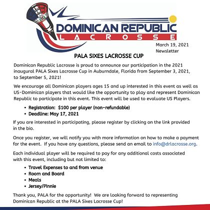 Dominican Republic Lacrosse is proud to announce our participation in the 2021 inaugural PALA Sixes Lacrosse Cup in Auburndale, FL from September 3, 2021 to September 5, 2021. We encourage all Dominican players (Men and Women) ages 15 and up interested in this event as well as US-Dominican players that would like the opportunity to play and represent Dominican Republic to participate in this event. This event will be used to evaluate players.