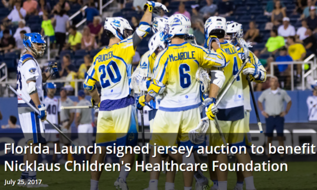via Launch web site The Florida Launch will auction game-worn jerseys from the 2018 season with proceeds benefiting the Nicklaus Children’s Healthcare Foundation. The EBay auction will begin this Wednesday (July 26) and end the following Wednesday (August 2).This season, some of the best lacrosse players in the world have donned a Florida Launch jersey. The Launch are excited to offer those same jerseys for a special auction with proceeds going to the Nicklaus Children’s Health Care Foundation. Each jersey is game-worn during the 2017 Major League Lacrosse season and is signed by the player who wore it.Each purchase will include a certificate of authenticity. Shipping and handling is up to $12 or local pickup is available for free. Items will ship after the final Launch game of the season. Pickup is available through the Launch office in Boca Raton. Please note, jerseys will ship after the conclusion of the Launch’s season (including potential playoff run).Jerseys for the players listed below will be available for bidding beginning Wednesday, July 26.Tim BarberMarty BowesSteven BrooksConnor BuczekLiam ByrnesDuncan ClancyJason CraneRyan DrennerTucker DurkinTim EdwardsWill GuralAustin KautNick MarianoChris MattesKieran McArdleMark McNeilSean MeagherDylan MolloyJarrod NeumannSteve PontrelloBenny PughPT RicciSergio SalcidoAlec TulettMike UntersteinChazz WoodsonJohn Yozzo-Scaperrotta
