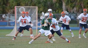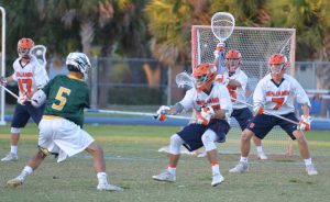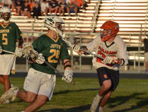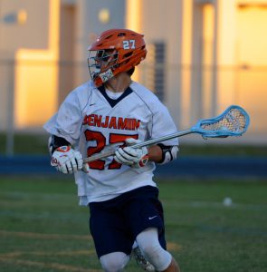 Jupiter came out flying in the third. Cronin going through pretty much the entire Benjamin defense (which prompted the above comment on ball carrying) and getting off a low shot just 16 seconds in for 5-4. Less than a minute later Gabriel was fed by Aranda with a skip pass to the top right side for the lengthy shot to the top left corner and at 10:33 Riley Linden made it 7-4 as he went down the right wing and found the low left, and it looked like Jupiter was taking control, as they had some good looks to make it an even bigger lead, but then the game turned again.At 7:39 of the third it was Griffin Bowie taking the Nicklaus feed from behind on the top right and his 12 yard bullet hit the top left corner for 7-5. Nicklaus then curled from behind the right side and hit the top short side at 5:36 to make it 7-6. The waived off goal followed soon after and then the unkindest cut of all for Jupiter as Cropp finished a left wing split dodge to tie it at 7 with just 1:02 left and Bowie hit what turned out to be the game winner with just 32 seconds left in the period as he curled from behind left.The fourth quarter might have been goal free but it certainly was pressure packed. Jupiter dominated possession. Outshot Benjamin 13-3 and Benjamin contributed 5 turnovers and 2 late penalties to Jupiter’s cause. But Michels cane up huge, as did the Benjamin defense, which let no inside shot get off when man down late.Which leads to one other old truism that sometimes gets forgotten. In big games like this, the more experienced team tends to find the way to win the one goal game and when you look at these rosters it’s easy to see which team that would favor.The Best Damn District Final . . . Period.Another night well spent for the sport. Team Statistics Faceoffs: Benjamin 10-8Shots: Jupiter 40-23Shots on Goal: Jupiter 24-17Turnovers: Benjamin 18-12Penalties: Benjamin 4-2 Individual Statistics BenjaminWill Nicklaus 2G/2ABlake Erdmann, Griffin Bowie and Christain Cropp with 2G eachMichael Buttelman 1AAustin Michels with 17 saves JupiterDenver Aranda, Kenny Cronin and Tanner Gabriel with 1G/1A eachDevon Rasmus, Chris Radice, Dylon Frankhouser and Riley Linden with 1G eachEthan Randell with 9 saves thanks to Coach Rye and Coach Loftus for talking to me before and after the game. [jetpack-related-posts]
