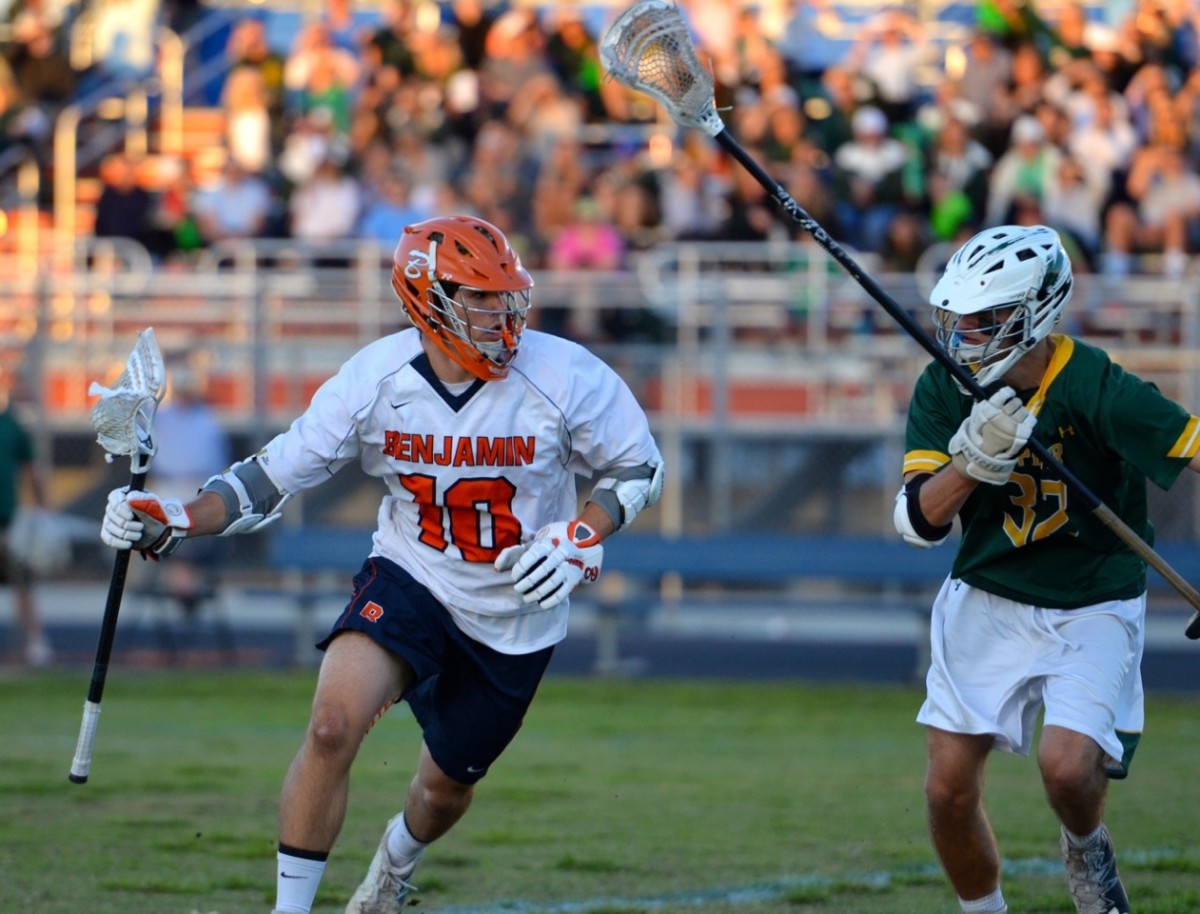 Okay , the crowd didn’t go wild (not for lack of size of it, it was a BIG crowd last night) but it’s not MSG with 19,000 so we’ll just say it was a pleasant surprise to see him be able to play after missing the entire season . . . and he did make a heck of an impact. If this game was a 44 minute game (okay technically 43:58), Jupiter wins this game easily. But in the last 1:02 or less of each quarter Benjamin outscored Jupiter 5-0.That’s pretty amazing.Austin Michels came up with 17 saves for Benjamin and shut out Jupiter for the last 22:27 of the game.And NEITHER TEAM scored in the fourth quarter.Jupiter had their chances . . . including 2 minutes of Man Up with 2:19 to go, but the Benjamin defense and Michels rose to the occasion to hold off the potential overtime.There even was an amazing call that wiped out a Jupiter goal late in the third quarter . . . a correct call that I was not even sure what the rule was. The referee who called it clarified it to me so here is what happened:Late in the third Benjamin had rallied within a goal and there was a goalie interference on Jupiter, giving Michels a chance to make an outlet pass on the delayed whistle. That pass was intercepted by Michael Dean about 5 yards away and Dean was able to find the net quickly with the shot that would have made it 8-6. It happened so quickly that the ref had to make a quick call to waive it off, which was the correct call. If it was a delay for a Jupiter player being in the crease instead I believe the ref would have more discretion to let the play stand, but goalie interference does not have that discretion. A proper call at a tough point in the game . . . and I doubt anyone there would believe it would be the last time a shot went into the net for the Warriors.So many other interesting things in this game. A number of momentum changes.7 goals for Jupiter and 7 goal scorers. 4 2-goal scorers for Benjamin.Jupiter actually put more shots on goal than Benjamin attempted, but the Bucs hit the cage with over 70% of them.And a third quarter that any boxing fan would recognize . . . when both teams landed knockdowns. Jupiter scoring three times in 1:27 to start the second half and take the 7-4 lead, only to see Benjamin tally the last four goals to go back up 8-7. And then there was a frightening moment late in the game too.In those last few frantic minutes of defense by the Bucs, a Jupiter player up top middle was able to step down and rip a shot that looked like it caught Benjamin sophomore middie Blake Chami on the side of the helmet and he went down in that scary manner of slowly, staying down for awhile before being helped off the field. He didn’t exactly look like he was shaking it off easily afterwards.Stick manufacturers, pay attention.Your stick designs are starting to endanger the kids and the game.And to the rulemakers . . . you are supposed to control the game, not the other way around. Make it easier to take the ball away and harder to wind up for shots that are less accurate. I have seen FIVE instances of this happening this year with a kid getting nailed by a wayward shot, more than ALL FOUR PREVIOUS YEAR’S COMBINED. No kid should be able to stickhandle through all 6 defenders, getting pinballed, and still be able to hold on. That tradeoff needs to start to favor shooting accuracy, not shooting power or ball carrying.It will make the game safer AND better.Please re-visit this ASAP. I might not be the best to listen to but someone like Richie Moran is, and he has been saying this for awhile.Listen to him, not me.