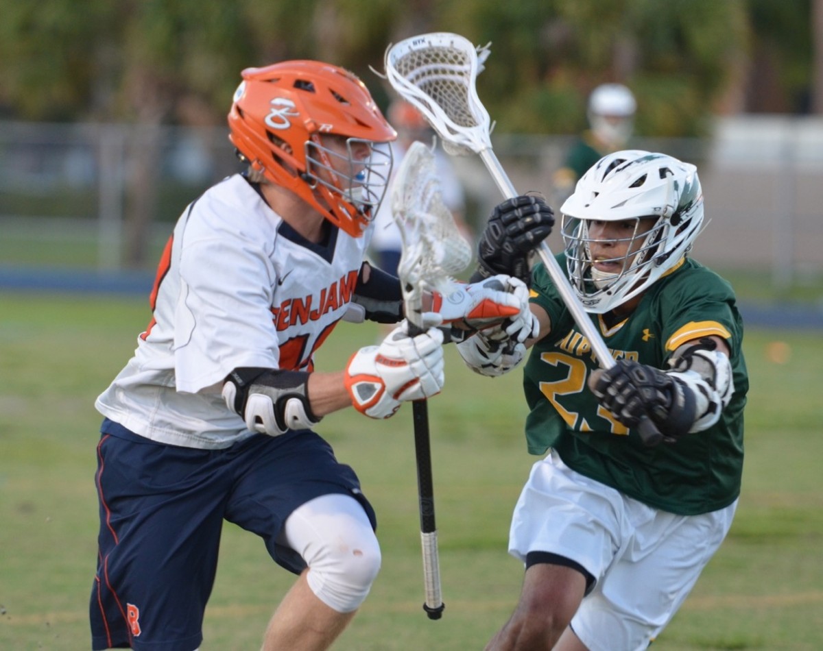 Jupiter came out flying in the third. Cronin going through pretty much the entire Benjamin defense (which prompted the above comment on ball carrying) and getting off a low shot just 16 seconds in for 5-4. Less than a minute later Gabriel was fed by Aranda with a skip pass to the top right side for the lengthy shot to the top left corner and at 10:33 Riley Linden made it 7-4 as he went down the right wing and found the low left, and it looked like Jupiter was taking control, as they had some good looks to make it an even bigger lead, but then the game turned again.At 7:39 of the third it was Griffin Bowie taking the Nicklaus feed from behind on the top right and his 12 yard bullet hit the top left corner for 7-5. Nicklaus then curled from behind the right side and hit the top short side at 5:36 to make it 7-6. The waived off goal followed soon after and then the unkindest cut of all for Jupiter as Cropp finished a left wing split dodge to tie it at 7 with just 1:02 left and Bowie hit what turned out to be the game winner with just 32 seconds left in the period as he curled from behind left.The fourth quarter might have been goal free but it certainly was pressure packed. Jupiter dominated possession. Outshot Benjamin 13-3 and Benjamin contributed 5 turnovers and 2 late penalties to Jupiter’s cause. But Michels cane up huge, as did the Benjamin defense, which let no inside shot get off when man down late.Which leads to one other old truism that sometimes gets forgotten. In big games like this, the more experienced team tends to find the way to win the one goal game and when you look at these rosters it’s easy to see which team that would favor.The Best Damn District Final . . . Period.Another night well spent for the sport. Team Statistics Faceoffs: Benjamin 10-8Shots: Jupiter 40-23Shots on Goal: Jupiter 24-17Turnovers: Benjamin 18-12Penalties: Benjamin 4-2 Individual Statistics BenjaminWill Nicklaus 2G/2ABlake Erdmann, Griffin Bowie and Christain Cropp with 2G eachMichael Buttelman 1AAustin Michels with 17 saves JupiterDenver Aranda, Kenny Cronin and Tanner Gabriel with 1G/1A eachDevon Rasmus, Chris Radice, Dylon Frankhouser and Riley Linden with 1G eachEthan Randell with 9 saves thanks to Coach Rye and Coach Loftus for talking to me before and after the game.
