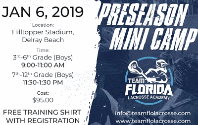 You are invited to participate in a High-Level Pre-Season Mini-Camp led by Jeff Goldberg winner of 14 Florida High School State Championships. Co-Directing this Mini Camp will be Coach Chris Spaulding winner of 4 Florida High State Championship with Lake Highland Prep High School.In addition to these 2 legendary coaches, other staff members will include US Lacrosse Hall of Fame Defender Chris Kane, 2 Time Attackman of the Year Paul Goldsmith, and Under Armour Head Coach Skip Flanagan. Other accomplished local former Team Florida Players. Mike Adler, Sebastian Fox, and Andy Wheeler will round out this phenomenal groupCoach Goldberg is launching a series of high- level mini-camps for youth and HS players to challenge their skill and unlock their full potential.We will be Limiting enrollment to 30 players per age group.