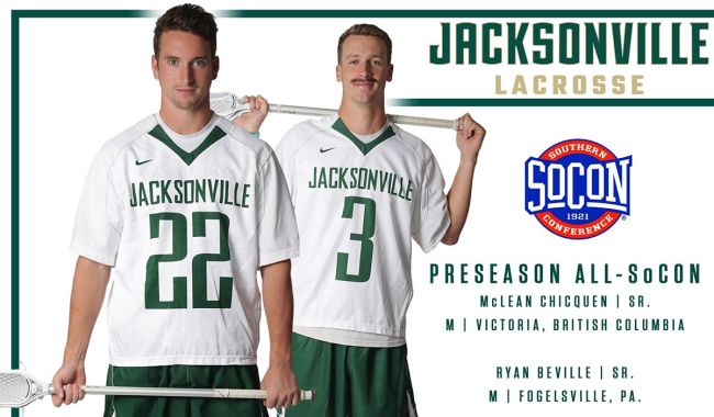 SPARTANBURG, S.C. – Senior captains Ryan Beville and McLean Chicquen represented Jacksonville University men’s lacrosse on the 2018 Preseason All-Southern Conference Team, as announced by the league Thursday. Additionally, the Dolphins were chosen fourth in the SoCon Preseason Coaches’ Poll.