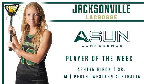 LAKE POINT, Ga. – For the second straight week, Ashtyn Hiron has taken home ASUN Conference Player of the Week honors for Jacksonville University women’s lacrosse, as announced by the league Tuesday afternoon.