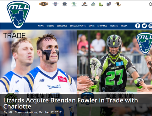 BOSTON (October 12, 2017) – The New York Lizards on Thursday acquired faceoff specialist Brendan Fowler from the Charlotte Hounds in exchange for midfielder Jacob Richard and a second-round selection in the 2018 MLL Collegiate Draft.Fowler, 25, is a two-time All-Star who has spent all four of his professional seasons in Charlotte. Last year, he won 156 of 328 faceoffs (48%) and tallied career highs in goals (9), assists (4) and points (13). He won a career-best 50 percent (207 of 411) of his faceoffs in 2015 and has won 49 percent of his faceoffs (583 of 1199) in his career. Drafted by Charlotte out of Duke with the 13th pick in the 2014 Collegiate Draft, Fowler registered 14 goals and seven assists for 21 points in 45 career games for the Hounds. He is a native of Wantagh, N.Y. and attended Chaminade High School, which is approximately five miles away from James Shuart Stadium, the home of the Lizards.Richard, 24, appeared in 11 games for New York last season and scored two goals with 14 groundballs in his second year with the club. As a rookie in 2016, Richard had two goals and two assists in nine games and picked up 11 groundballs. New York selected him in the fourth round of the 2016 Collegiate Draft out of Marquette.