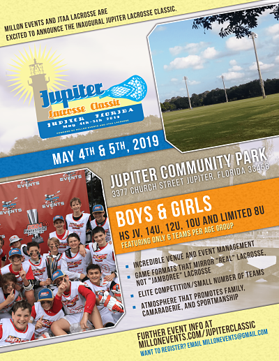 via press release FOR IMMEDIATE RELEASE:Millon Events is pleased to announce the inaugural Jupiter Lacrosse ClassicBaltimore, MD—October 10, 2018 – Millon Events and JTAA Lacrosse is excited to announce the inaugural Jupiter Lacrosse Classic. The event will be held May 4th and 5th, 2019 at the beautiful Jupiter Community Park and positioned as the ultimate boys and girls lacrosse event in the South. The event will be a great kick off to summer and geared towards the player and family experience as well as a celebration of the sport of lacrosse in Florida. Highlights will include a combination of impeccable fields, elite level teams, well trained officials, and best-in-class event management.The small boutique style event will feature desirable game formats that look like true lacrosse games with quarters and timeouts rather than the standard running time and halves that the large tourney operators use for simplicity. Camaraderie and sportsmanship will be a heavy focus and the family experience will be second to none. The event will be open to boys and girls teams at HS JV, 14U, 12U, 10U and limited 8U and will feature only eight teams per age group.“We are very excited to partner with the JTAA on the Jupiter Lacrosse Classic. The event is going to be a world class competitive lacrosse event in one of the most beautiful parts of the country. The events we have done the past few years have been all about creating an atmosphere that promotes family, camaraderie, and sportsmanship. The feedback from the teams and participants has been overwhelming. I’m really confident the teams, players, families, coaches in Florida will feel no different and are going to love it. ”said Mark Millon, Millon Events COO.