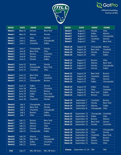 via MLL press release A New League Experience for Players and Fans Will Begin on Friday, May 31, 2019 With Two MatchupsBOSTON (November 29, 2018) – Major League Lacrosse announced today a robust 2019 regular season schedule, opening during the weekend of May 31 – June 2, that includes a five game slate highlighted by the defending champion Denver Outlaws facing the New York Lizards.The 2019 schedule includes many changes advocated for by the league’s players, including a season start date after Memorial Day and an emphasis on playing weekend games. In addition, each team will play each other twice, the first time that has occurred since 2015, before the league expansion to include the Atlanta Blaze.In conjunction with its schedule announcement, MLL will continue its partnerships with both ESPN and Lax Sports Network (LSN) to bring games to screens across the country. ESPN, via its ESPN+ service, will feature a Game of the Week. The league’s All-Star Game, taking place July 27, will be broadcast on ESPN2, while the Championship on September 29, will be shown on ESPNEWS. The All-Star game will be played in Navy-Marine Corps Memorial Stadium on July 27th. Championship Weekend will be September 27th – 29th and the location will be announced at a later date.“This schedule is the result of input from our players, coaches, GMs and team presidents,” said Alexander Brown, MLL Commissioner. “It reflects our commitment to consistently improve the experience for our fans, our players, and our teams. The schedule highlights the best rivalries in the game and features a great lineup for our broadcast partners.”In addition to the Outlaws-Lizards match, MLL opening weekend will see the Atlanta Blaze traveling to face their Southern rivals the Florida Launch on Friday, May 31. On Saturday, June 1, the 2017 champion Ohio Machine travel to face the Boston Cannons, one of the league’s original franchises. Closing out the opening slate on Sunday, June 2, the Blaze will face the Chesapeake Bayhawks and the Dallas Rattlers will host the Charlotte Hounds.The 2019 schedule features 58 weekend games and only 14 weekday games, something players and fans alike called for. In addition, the league took player input into account in limiting doubleheader weekends.“As I enter into my 11th season playing in Major League Lacrosse, I can confidently say that this new schedule will offer the greatest experience for the player,” said Bayhawks midfielder Matt Abbott, a 10-year veteran of the league. “Starting the season after Memorial Day allows us to get all of our rookies in from day 1, cutting back on weekday games makes it easier for players to travel and the additional games added to the season gives us more opportunities to get out in front of the fans.”Other schedule highlights include the Outlaws opening their home slate with a 2018 championship game rematch against the Dallas Rattlers on June 27. In what has become a league tradition, the Outlaws will also host their annual Fourth of July game. Typically, the largest regular season game of the year with crowds between 20,000-30,000, this year’s edition will feature a 2018 semi-final rematch against the Chesapeake Bayhawks.“We had a fantastic season last year, and as we look at next year’s schedule we are looking forward to holding onto the Steinfeld Trophy in 2019,” said Mac Freeman, President of the Denver Outlaws and Senior Vice President of Business Development for the Denver Broncos. “In our first home game of the season we will face-off against Dallas, who I am sure will be out for revenge; but with home field advantage and the best fans in lacrosse behind us, we look forward to putting on a great show.”The league partnered with GotPro, a sports software company, in creating this year’s schedule. This state-of-the-art scheduling software helped find the best slate of games given each teams’ specific needs.“GotPro is pleased to have helped MLL on the 2019 season schedule,” said GotPro founder and president Gavin Owen-Thomas. “While we work with professional sports leagues from all around the globe, we were excited to enter into a partnership with MLL for the next three years. Our best-in-class software is now pairing with the best lacrosse has to offer. As lacrosse continues to grow, GotPro looks forward to bringing our tailor-made software products to lacrosse leagues and teams across the country.” About Major League LacrosseMajor League Lacrosse (MLL), the premier professional outdoor lacrosse league, is headquartered in Boston. MLL has led the sport of lacrosse into the mainstream of competitive team sports since 2001. In the spring of 2018, MLL entered into new leadership for the first time in 17 years when it selected Alexander Brown as the Commissioner. The league is made up of nine teams: The Atlanta Blaze, Boston Cannons, Charlotte Hounds, Chesapeake Bayhawks, Dallas Rattlers, Denver Outlaws, Florida Launch, New York Lizards, and Ohio Machine. Additional League InfoWebsite: majorleaguelacrosse.comInstagram: instagram.com/majorleaguelaxTwitter: twitter.com/MLL_Lacrosse About GotProGotPro is a sports software company who specializes in providing the most robust software for organizations to run their leagues, referees, players, etc. They provide powerful, tailor made software products to fit any league or organization’s needs all under one umbrella. Their clients include: Major League Soccer, United Soccer League, Major League Rugby, Chinese Basketball Association and Cricket Australia.Website: https://www.gotpro.com/int/en/