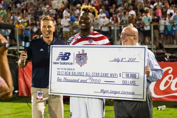 via MLL press release BOXSCOREGAME RECAPSACRAMENTO, Calif. (July 8, 2017) – Playing in the first All-Star Game of his career, Myles Jones scored the game-winning goal in overtime, helping Team Stripes beat Team Stars in the 16th MLL All-Star Game, 21-20, at Papa Murphy’s Park in Sacramento.Jones was awarded a $10,000 prize check courtesy of New Balance for winning the MVP of the game. The Bayhawks midfielder led his team with four goals and finished with five points total (one assist).Team Stars held a 10-7 lead at the half thanks to five goals in the opening half from Ohio’s Marcus Holman.Matt Abbott’s goal for Team Stripes 12:09 into the fourth quarter tied the game 19, but it was followed by a Kyle Denhoff go-ahead goal less than a minute later for Team Stars. Connor Buczek, who won the Hardest Shot in the All-Star Skills Competition, scored another game-tying goal at the 14:24 mark to send the game to OT.It took Jones just 1:20 into the extra frame to cut straight down the middle of the field and score the winning goal from just left of the crease.PLAYERS OF NOTEMarcus Holman led all scorers with six points for Team Stars. The Machine attackman currently leads the league in points with 40 (28 goals, 12 assists).In the final All-Star Game of his career, Greg Gurenlian won 13 of his 22 faceoffs (59%) for Team Stripes.Will Manny had five points (3 goals, 2 assists) for Team Stripes.Tyler Fiorito made 11 saves total and six saves in the fourth quarter alone for Team Stripes.