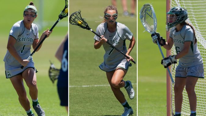 via press release – photo via Stetson web site Stetson’s Sam Maguire, Lindsay Summers and Liza Diamond earned all-conference lacrosse honors as the Atlantic Sun Conference handed out their annual post-season awards tonight in Jacksonville at the ASUN Tournament awards banquet.Maguire and Summers were both named 2nd-team all-conference while Diamond was named to the ASUN’s All-Freshman team.Maguire set a school record by scoring 40 goals during the regular season. Stetson’s all-time leader in career goals with 70, Maguire currently ranks among ASUN leaders in goals (12th), shots (14th) and points (24th). The senior has 10 multi-goal games this year, including a career-high six goals in a 20-8 win over Central Michigan.Summers lands a spot on the second team for the second straight year. The senior attack leads the Hatters in points (50) and assists (28) and is fourth on team with 22 goals. She is sixth in the ASUN in assists and 16th in points. Summers is Stetson’s career leader in both points (154) and assists (87).Diamond played every minute in goal for Stetson during her freshman campaign. She leads all conference goalies in minutes played (1027:43) while ranking third in the ASUN in saves (145). She has made 10 or more saves six times. In Stetson’s 24-0 win at Delaware State, Diamond recorded the first shutout in program history.The ASUN Tournament starts Thursday as No. 6 seed Stetson faces No. 3 seed Furman at 4 p.m. on ESPN3.