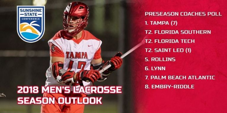 Author’s Note: At the SSC web site, as part of this story, is a video clip of each school’s preview, produced by the members of the conference. We will bring you these videos separately, 2 at a time, for 4 separate articles. Tampa does not have one listed at the website currently.MELBOURNE, Fla. – Sunshine State Conference men’s lacrosse coaches select the University of Tampa as the preseason favorite to win the 2018 league title. The 2017 SSC regular season and tournament champs received 49 total votes and seven first-place votes. Florida Southern College, Florida Tech, and Saint Leo University tied for second place in the poll at 33 total votes apiece. Rollins College narrowly missed the tie for second place after garnering 29 total votes, which lands them fifth in the poll. Lynn University, Palm Beach Atlantic University, and Embry-Riddle Aeronautical University round out the ranking in sixth, seventh, and eighth positions. VIDEO: 2018 Men’s Lacrosse Season Outlook interviews with Head Coaches Tampa (15-5, 5-0) won their fourth consecutive SSC regular season and tournament titles in 2017. The Spartans earned an automatic qualifying bid to the NCAA regional tournament where they traveled to and defeated Lenoir-Rhyne University 11 to 8. Tampa ended its season in a 12-10 national semifinal loss to top-seeded Limestone. Sunshine State Conference play opens up on March 17th with Palm Beach Atlantic hosting Embry-Riddle. The SSC Championship will take place on April 27th and April 29th at a non-predetermined site. The NCAA Division II postseason for men’s lacrosse will start at non-predetermined sites Friday, May 11th and concludes Sunday, May 27th in Boston, Massachusetts. Below are the full results of the 2018 SSC preseason coaches’ poll. Coaches are not allowed to vote for their teams (points: 8-7-6-5-4-3-2-1, first-place votes in parentheses). 2018 SSC MEN’S LACROSSE PRESEASON COACHES POLL
