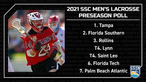 via SSC press release MELBOURNE, Fla. – For the eighth consecutive season, Sunshine State Conference men’s lacrosse coaches select the University of Tampa as the preseason favorite. With 36 points and six first-place votes in the poll, the Spartans are expected to recapture the league’s regular-season championship.Florida Southern College is chosen as the top challenger by finishing second in the poll with 26 points. Rollins College lands in third place with 22 points and also draws the final first-place vote. Lynn University and Saint Leo University are tied in fourth place with 19 points apiece, while Florida Tech (18 points) and Palm Beach Atlantic University (6 points) round out this season’s rankings.Record Book: “SSC Men’s Lacrosse Records: “2014 – 2020”SSC teams played between four and eight games in 2020 by the time the season was cut short due to the Coronavirus. Tampa finished the shortened season with a league-best 8-0 overall record, while the rest of the league collectively hovered around .500. No team played a conference game in 2020.In 2019, Lynn became the third program to win the SSC regular-season championship since men’s lacrosse became a sponsored sport in 2014. Tampa, nonetheless, maintained its stranglehold on the league’s postseason title, winning the SSC tournament for a sixth consecutive season. Following the conference tournament, the Spartans hosted and defeated Wingate University in the opening round of the NCAA tournament. Tampa then traveled to Gaffney, South Carolina, where they lost a double-overtime national quarterfinal battle to Limestone College.The 2021 season opens up with Tampa at Saint Leo on March 19th, followed by FSC at Florida Tech and PBA at Lynn on March 20th. See the full schedule here. There is no SSC postseason championship in 2021. The NCAA Division II postseason begins May 12th at non-predetermined sitesBelow are the full results of the 2021 SSC preseason coaches’ poll. Coaches are not allowed to vote for their teams (points: 6-5-4-3-2-1, first-place votes in parentheses).