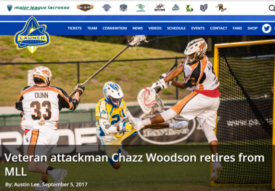via the Launch web site – written by Austin Lee, picture from Launch web site Excerpt:After a career that has spanned 12 years and seven different teams, one of Major League Lacrosse’s most exciting players can walk away with no reservations.“Part of the main reason I am stepping away now is the fact that I get to step away on my own terms and be okay with how I finished,” said Florida Launch veteran Chazz Woodson.On a warm April night, a charter bus of weary Launch staffers and players made their way back to Boca Raton. The team’s first game of the season was held in DeLand, Florida as the Launch awaited the completion of FAU Stadium renovations. In that game, the visiting Boston Cannons stole an overtime victory and the home team was sent home – hungrier than ever.Chazz, occupying a row of the bus’s back seat, laid out his legs in an attempt to get some semblance of comfort during the four hour trek home. He had given his all that day. Every ounce of effort and energy was poured into his play and with a resulting limp in his step – it showed. Despite the pain, he was just happy to be back in the league.Woodson, 35, left the league in 2014 after being let go from the Launch, by then head coach Stan Ross, in what Woodson refers to as “technically retirement,” but the former Brown University standout knew he still had something left to give. Read the rest HERE